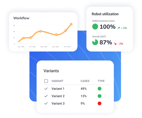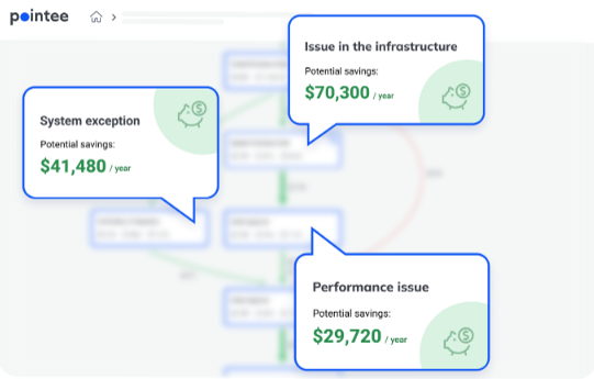 Entdecken Sie mit Pointee die Schwachstellen Ihrer Roboter, identifizieren Sie die Ursachen von Ausfällen und erhalten Sie sofortige Einblicke, um Ihre Prozesse zu verbessern. Durch die gezielte Behandlung von Engpässen, Leistungs- und Infrastrukturproblemen können Sie die Betriebseffizienz steigern und gleichzeitig Kosten senken. Unsere benutzerfreundliche Benutzeroberfläche dient als Standardwerkzeug für die Bewertung und Optimierung von RPA-Prozessen, um die Leistung Ihrer Robotikprozesse kontinuierlich zu verbessern.